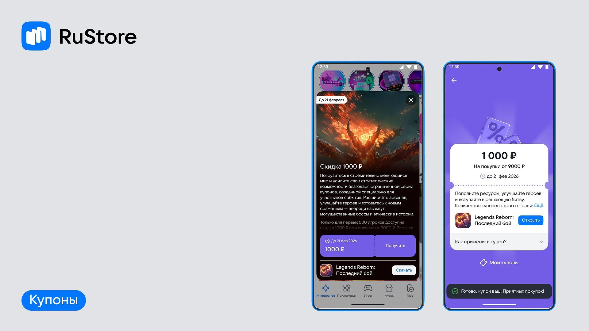 Система купонов помогает разработчикам стимулировать покупки и привлекать новую платёжную аудиторию непосредственно внутри магазина приложений. Согласно данным RuStore, благодаря применению купонов средний чек может вырасти до 60%, а средний доход с одного пользователя — на 77%. Вместе с ранее введенной функцией предзаказов и категорией "Избранное" можно легче привлечь новых пользователей на запуске.